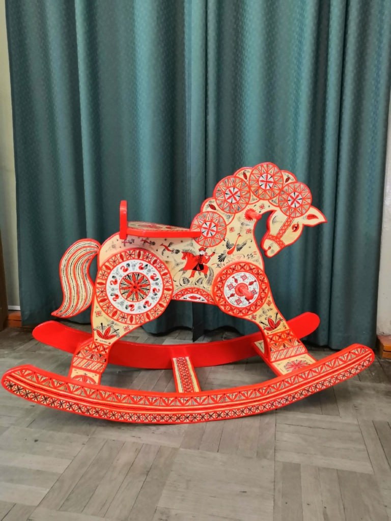 На выставке можно увидеть работы Н. Польдяевой, выполненные в разных техниках росписи. Среди них «Лошадка-качалка» – творческий итоговый проект, подготовленный Натальей к своей выпускной квалификационной работе.